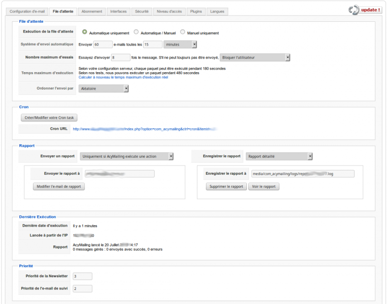L'onglet Configuration de la file d'attente est un endroit qu'il est bon d'avoir visité au moins une fois! On y spécifie les paramètres et surtout la cadence des envois.