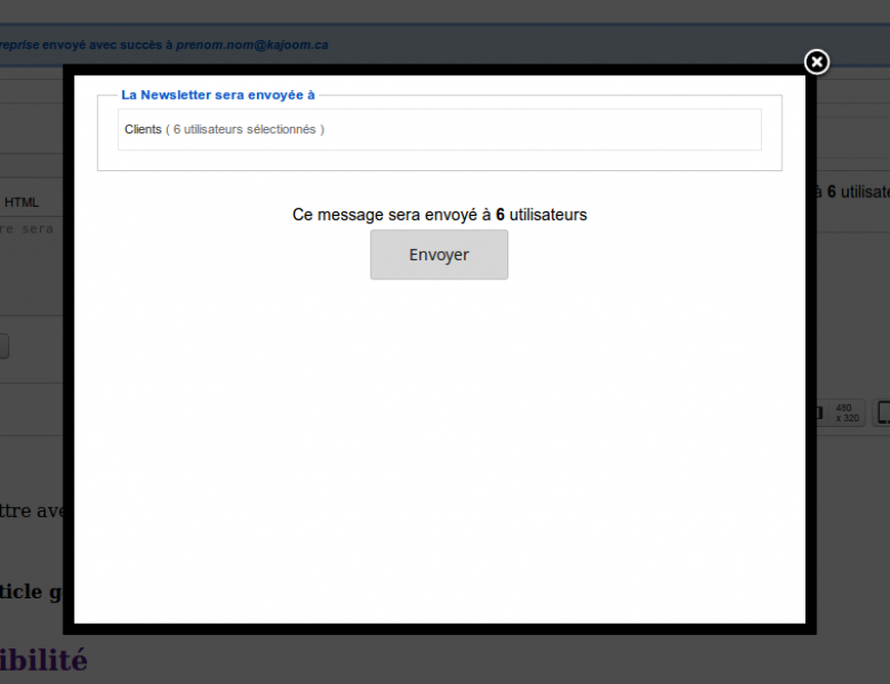 En cliquant sur l'icône Envoyer en haut à gauche de l'interface d'édition d'une infolettre, vous obtiendrez une fenêtre de confirmation résumant les listes d'abonnés visés et le nombre d'utilisateurs totaux.